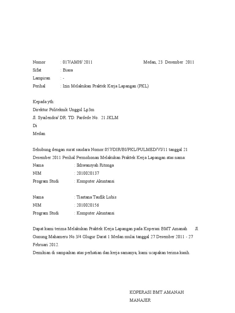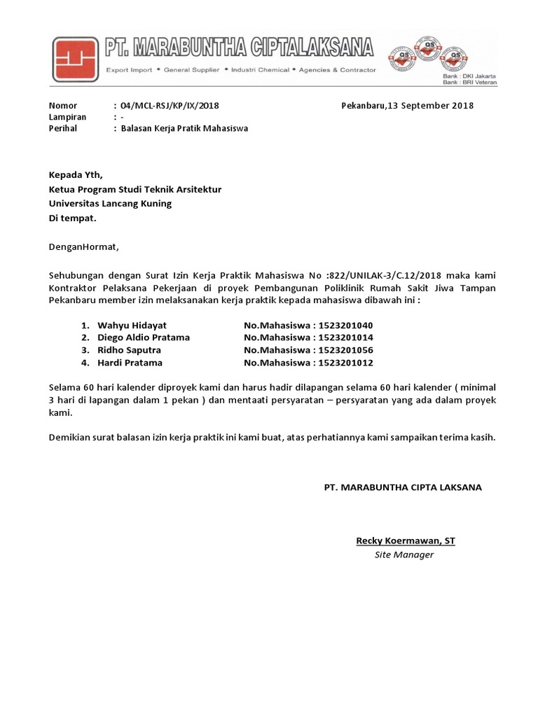 Surat Balasan Magang Zin Praktek Kerja L from data03.123doks.com Sehubungan dengan surat permohonan praktik kerja lapangan (pkl) yang telah anda kirimkan ke alamat kantor kami pada tanggal 25 februari 2019, maka dengan ini kami memberitahukan bahwa anda diterima untuk melakukan praktik kerja lapangan terhitung sejak tanggal 11 maret 2019. Contoh surat balasan penerimaan pkl jurusan akuntansi. Dengan hormat, menindak lanjuti surat permohonan prakerin no. 33% (3) 33% menganggap dokumen ini bermanfaat (3 suara) 9k tayangan 2 halaman. Download contoh surat balasan dari perusahaan. Contoh surat lengkap contoh surat balasan permohonan kerja praktek docx size 13 kb. Bersama ini kami sampaikan bahwa mahasiswa tersebut di atas dapat kami terima untuk melaksanakan kerja praktik di perusahaan. The collection that consisting of chosen picture and the best amongst others.
